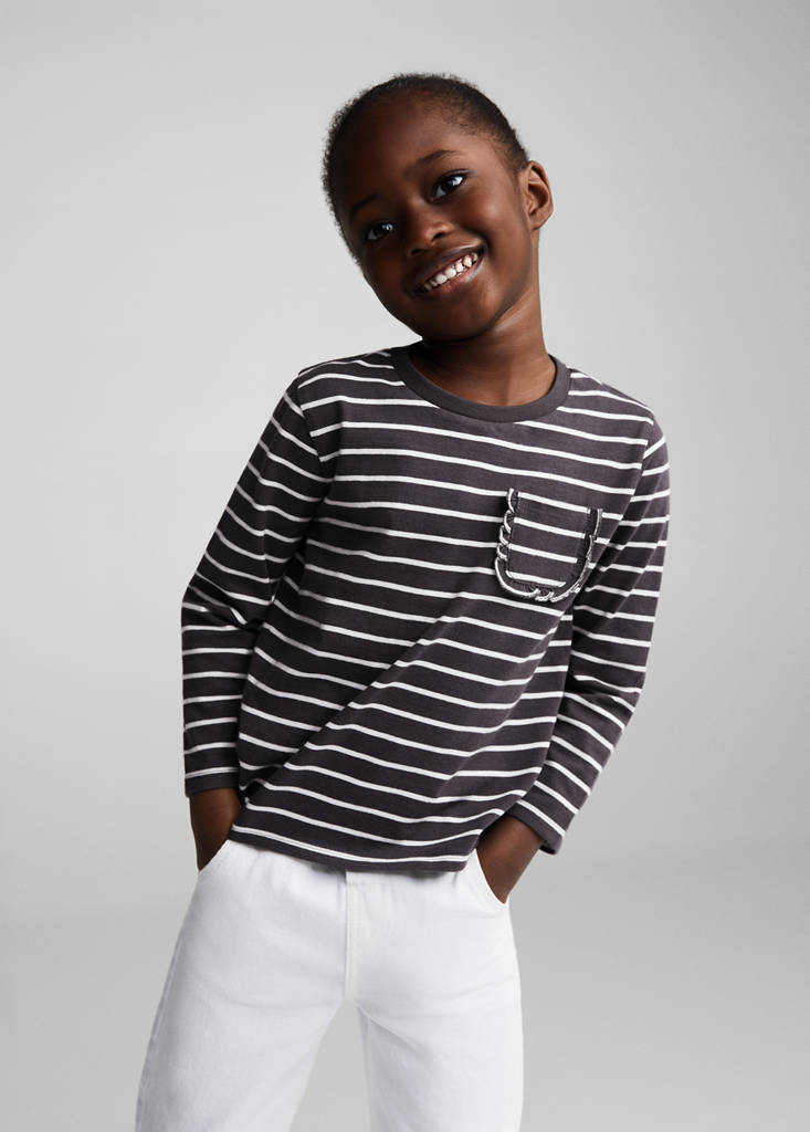 Striped long sleeves t-shirtPrice historyInitial price struck through [€ 7,99 ]€ 7,99Second price struck through [€ 5,99 ]€ 5,99Current price [€ 3,99 ]€ 3,99-50 %Select a colourCharcoalSelect your size9-12 months (80cm)Not available. I want it!12-18 months (86cm)Not available. I want it!18-24 months (92cm)Not available. I want it!2-3 years (98cm)Not available. I want it!3-4 years (104cm)Not available. I want it!4-5 years (110cm)Not available. I want it!DimensionsNotify meStraight design. Striped print. Patch pocket on the chest. Round neck. Long sleevesDetails, composition and careStore availabilityItem qualitiesRecycled cottonAt least 20 %This fibre is obtained from pre- and post-consumer textile waste that is transformed into new fabrics.