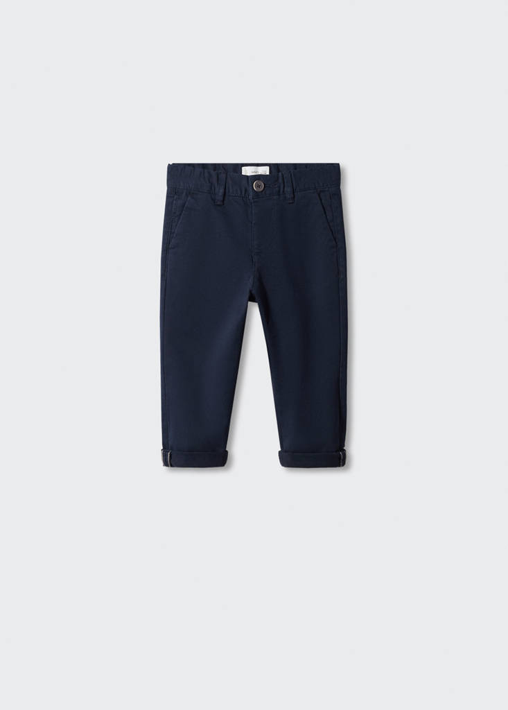 Cotton fabric. Straight design. Two side pockets. Two welt pockets at the back. Zip and button fastening. Back to school