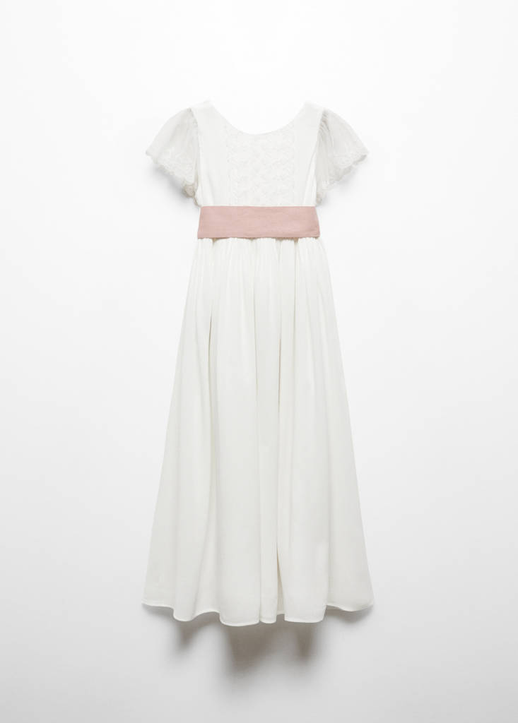Embroidered fabric. Straight design. Bow on the waist. Round neck. Short sleeves. Button fastening on the back section. The dress length is 100 cm. The model is 140cm tall and is wearing a size 10