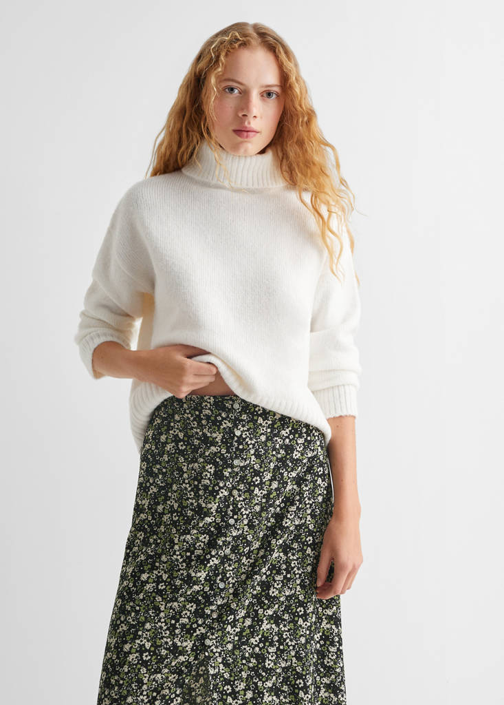 Floral print. Straight design. Midi design. Elasticated waistband. Opening at the bottom. Button up. Viscose fabric