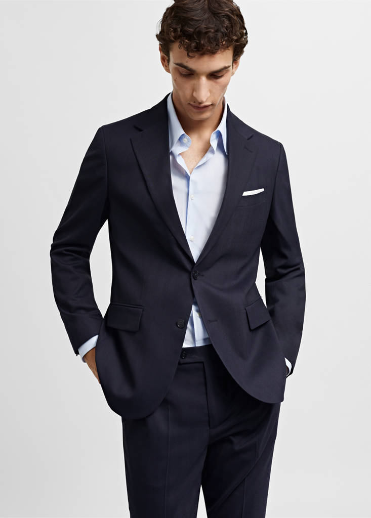 Bi-stretch fabric: its flexibility in all directions provides adaptability and comfort. Non-crease. Wool mix fabric. Slim fit. Herringbone structure. Lapel with notch. Chest welt pocket. Two pockets with flaps on the front. Double back slit. Two inner pockets. Inner lining. Tailoring collection. Thermoregulating: This fabric offers optimal breathability to keep you at a stable temperature. Front closure with buttons. Long buttoned sleeves
