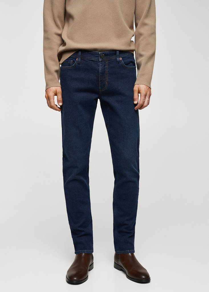 Slim fit. Dark wash. Denim-style cotton fabric. Mid-rise. Belt loops. Zip and button fastening. Two front pockets. Coin pocket. Two patch pockets at the back. The trousers measure 112 cm for the base size 42: 7 cm more than usual