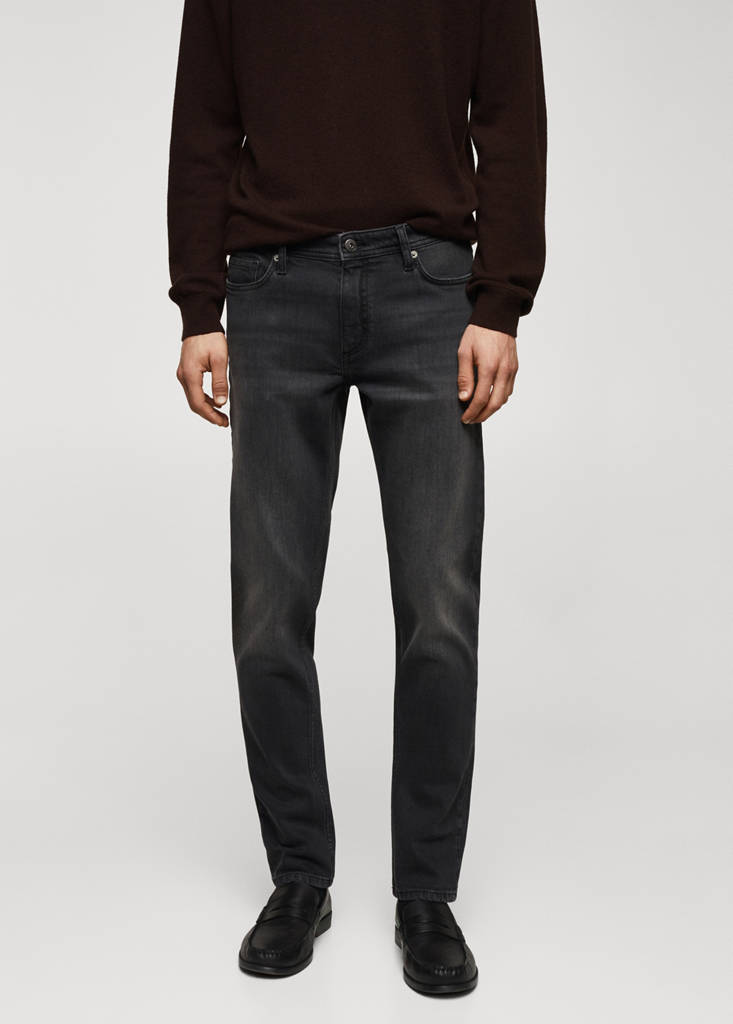 Slim fit. Dark grey wash. Denim-style cotton fabric. Mid-rise. Belt loops. Zip and button fastening. Two front pockets. Coin pocket. Two patch pockets at the back. The trousers measure 112 cm for the base size 42: 7 cm more than usual