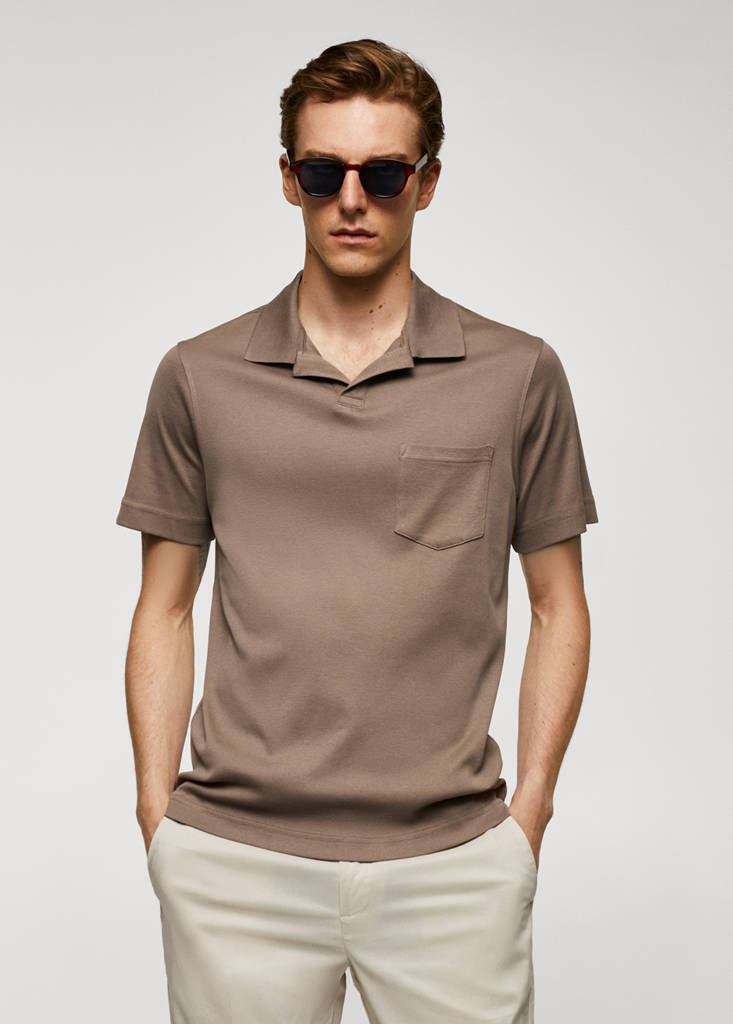 Lightweight fabric. Slim fit. Patch pocket on the chest. V-neck polo collar without closure. Short sleeves. Straight hem with side slits. Standard design. 100% cotton fabric