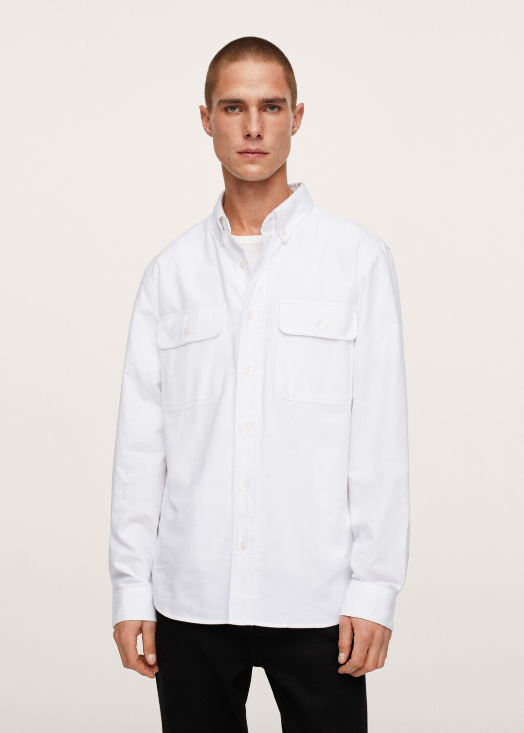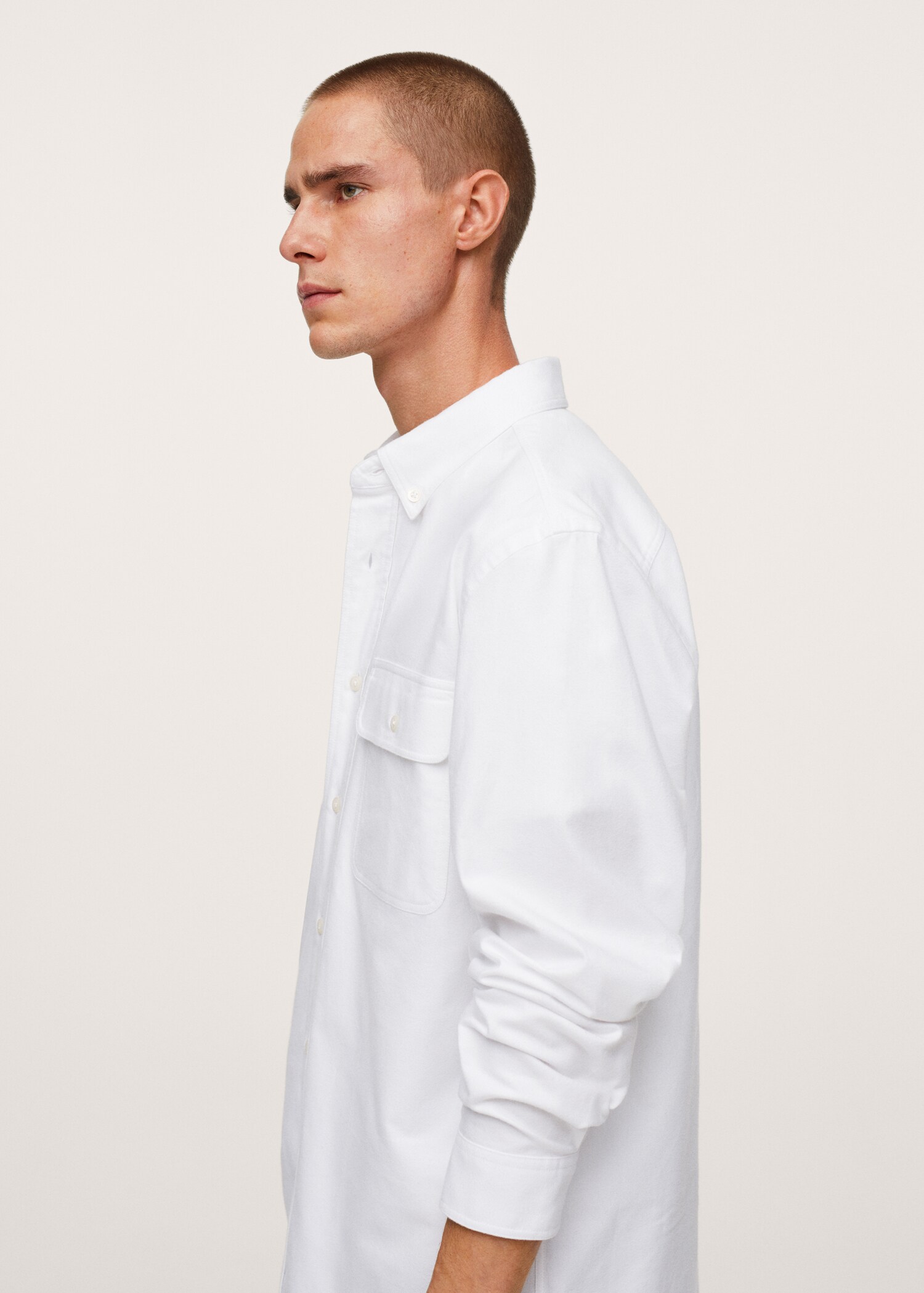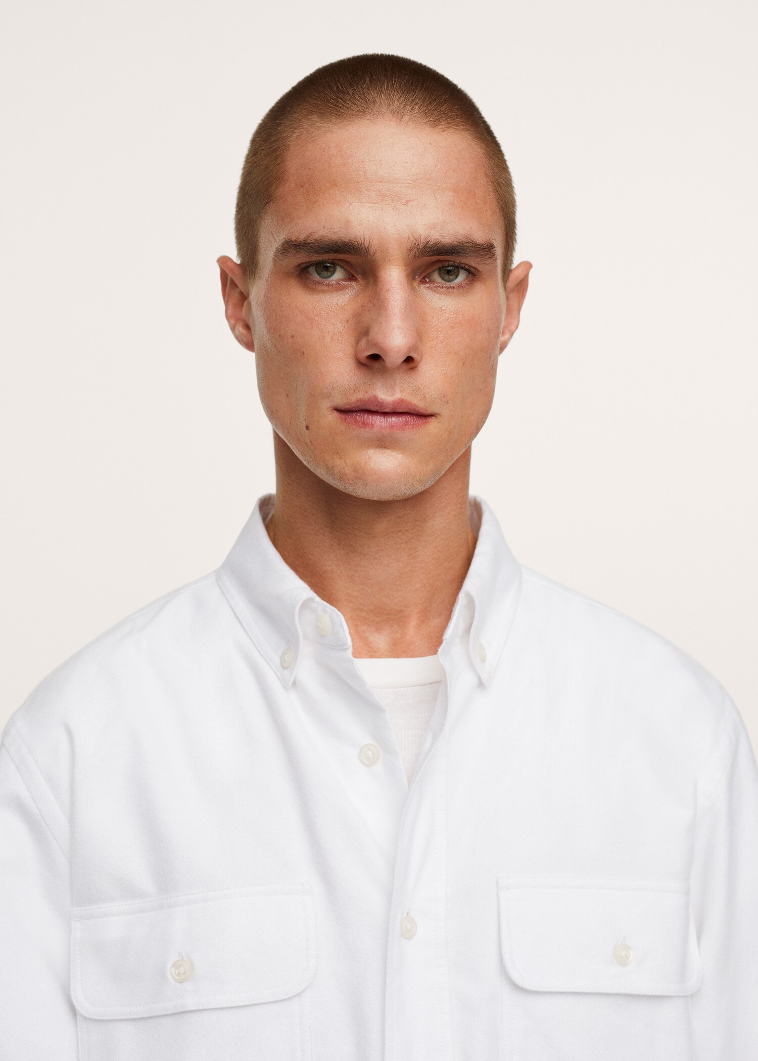 Online Exclusive. Long sleeve. Light fabric. Front closure. Standard design. Regular neck. Regular fit. Sustainable cotton fabric. Textured fabric. Classic collar. Long buttoned sleeve. Two-buttoned flap chest pockets. Button up. The model is 183 cm and is wearing a size M.