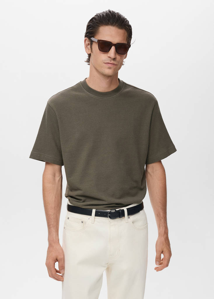 Relaxed fit. 100% Cotton. Fabric with microstructure. Round neck. Short sleeves. Ribbed finish on neck, sleeves and hem. Straight hem