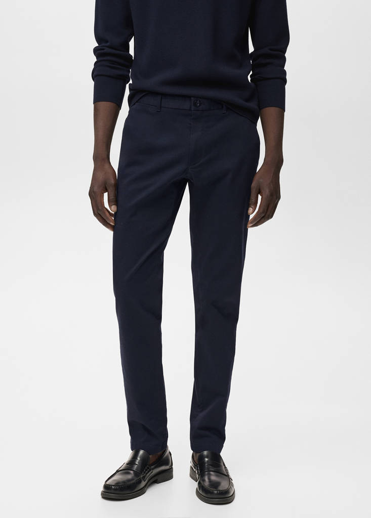 Slim fit. Chinos style. Cotton elastic. Belt loops. Two side pockets. Coin pocket. Two welt pockets at the back. Zip and button fastening