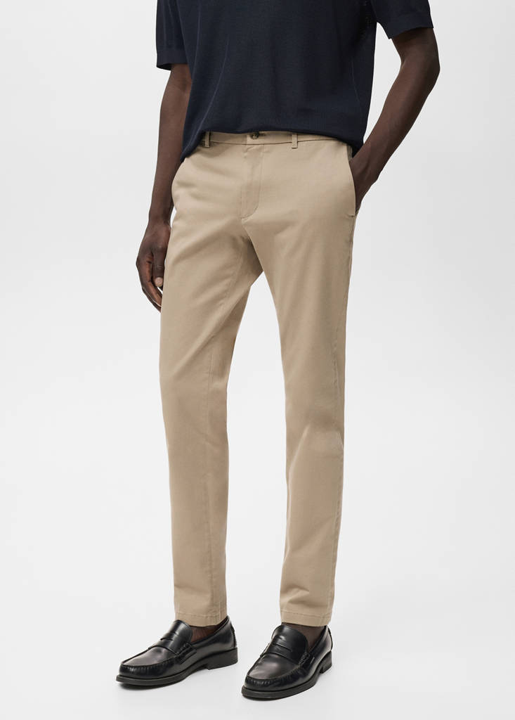 Slim fit. Chinos style. Cotton elastic. Belt loops. Two side pockets. Coin pocket. Two welt pockets at the back. Zip and button fastening