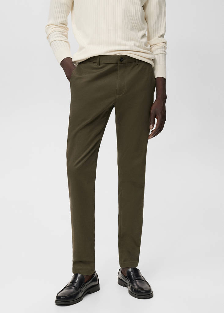 Slim fit. Chinos style. Cotton elastic. Belt loops. Two side pockets. Coin pocket. Two welt pockets at the back. Zip and button fastening