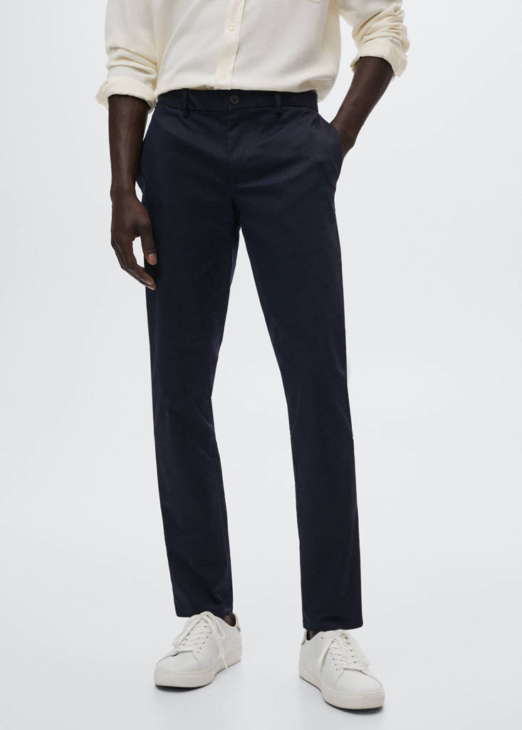 Basics Collection. Slim fit. Sustainable cotton blend fabric. Serge fabric. Chinos style. Loops. Zip and button fastening. Two side pockets. Two welt pockets on the back. These trousers are available in sizes with an extra 5 cm length, to help you maintain the original fit, regardless of your height. The model is 183cm and is wearing a size 42