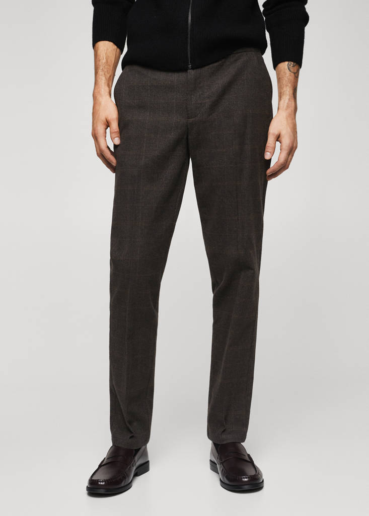 Basics Collection. Slim fit. Sustainable cotton blend fabric. Loops. Elastic back waistband. Two side pockets. Two welt pockets on the back. Zip and one button fastening. The model is 185 cm tall and is wearing a size 42