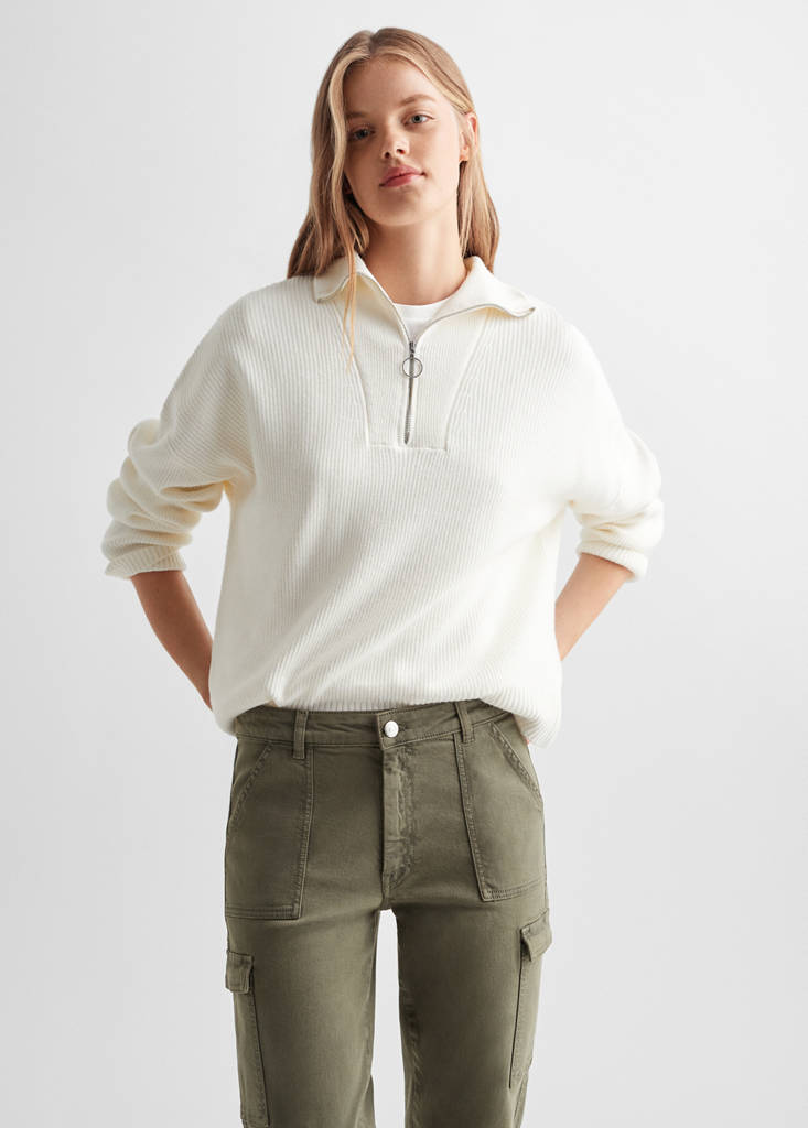 Cotton fabric. Cargo design. Straight design. Long design. Belt loops. Mid-rise. Two patch pockets at the front. Two cargo pockets. Two pockets with flaps on the back. Zip and button fastening