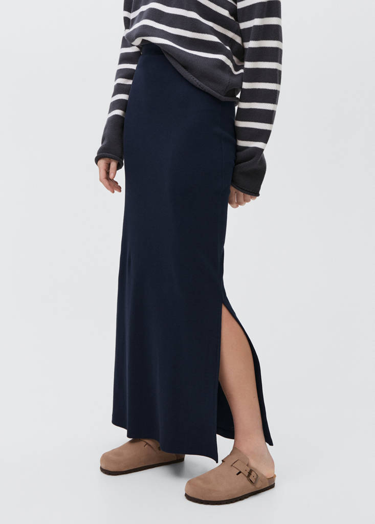 Long skirt with side slitPrice historyInitial price struck through [€ 22,99 ]€ 22,99Second price struck through [€ 17,99 ]€ 17,99Current price [€ 7,99 ]€ 7,99-65 %Select a colourDark NavySelect your sizeXXSXSSMLast few items!LNot available. I want it!DimensionsAddCotton fabric. Straight design. Side slit. Elasticated waistbandDetails, composition and careStore availabilityItem qualitiesRecycled cottonAt least 20 %This fibre is obtained from pre- and post-consumer textile waste that is transformed into new fabrics.