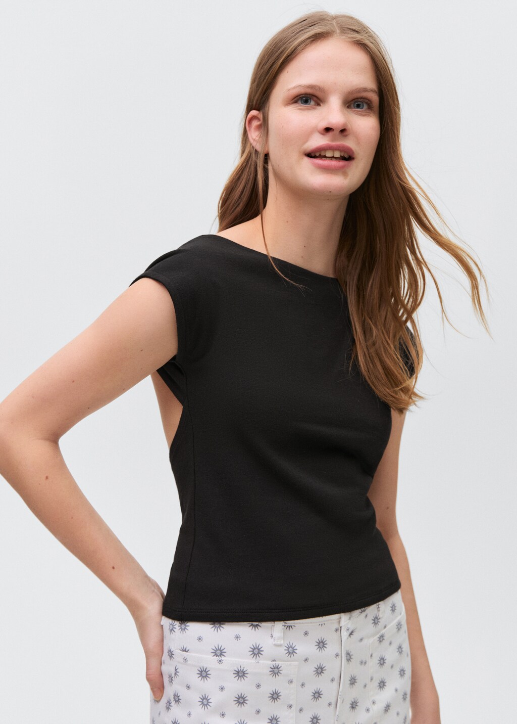 T-shirt with open backPrice historyInitial price struck through [€ 15,99 ]€ 15,99Second price struck through [€ 11,99 ]€ 11,99Current price [€ 10,99 ]€ 10,99-31 %Select a colourBlackSmall garment - Choose one size up from the usualSelect your sizeXXSLast few items!XSLast few items!SLast few items!MLast few items!LAddDescription100% cotton fabric. Straight design. Boat neckline. Short sleeves. Open back.See detailsItem qualitiesRecycled cottonAt least 20 %This fibre is obtained from pre- and post-consumer textile waste that is transformed into new fabrics.Share