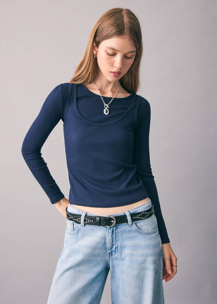 Double-layered T-shirtPrice historyInitial price struck through [€ 19,99 ]€ 19,99Current price [€ 15,99 ]€ 15,99-20 %Select a colourNavySelect your sizeXXSNot available. I want it!XSNot available. I want it!SNot available. I want it!MNot available. I want it!LNot available. I want it!MeasurementsNotify meCotton t-shirt. Straight Design. Double-layer detail. Round neck. Long sleevesDetails, composition and careStore availability
