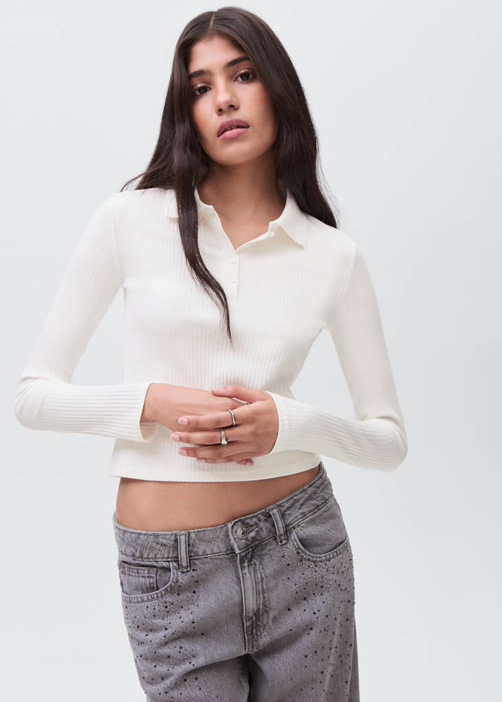 Ribbed polo t-shirtPrice historyInitial price struck through [€ 19,99 ]€ 19,99Current price [€ 15,99 ]€ 15,99-20 %Select a colourOff WhiteSmall garment - Choose one size up from the usualSelect your sizeXXSNot available. I want it!XSLast few items!SNot available. I want it!MNot available. I want it!LLast few items!AddCotton fabric. Stretch fabric. Ribbed knit. Straight Design. Polo-neck with button closure. Long sleevesDetails, composition and careStore availabilityItem qualitiesRecycled cottonAt least 20 %This fibre is obtained from pre- and post-consumer textile waste that is transformed into new fabrics.