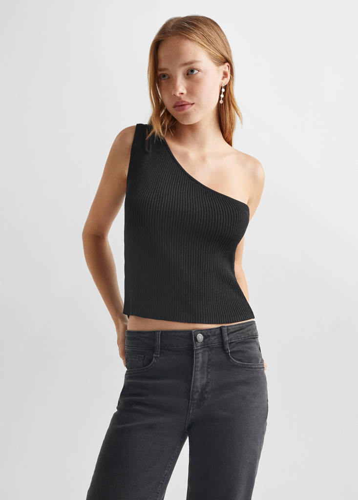 Fine knit fabric. Asymmetric design. Crop design. Wide straps. Asymmetrical neckline. Sleeveless