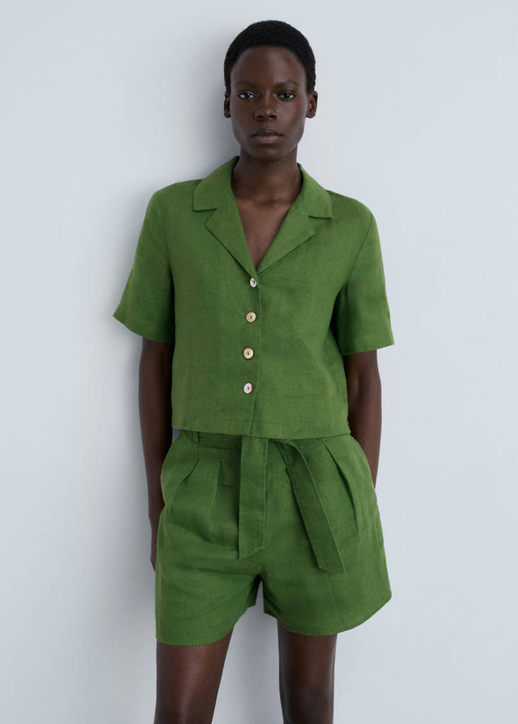 100% linen fabric. Standard design. Straight design. Shirt collar. Lapel with notch. Short sleeves. Button fastening at the front