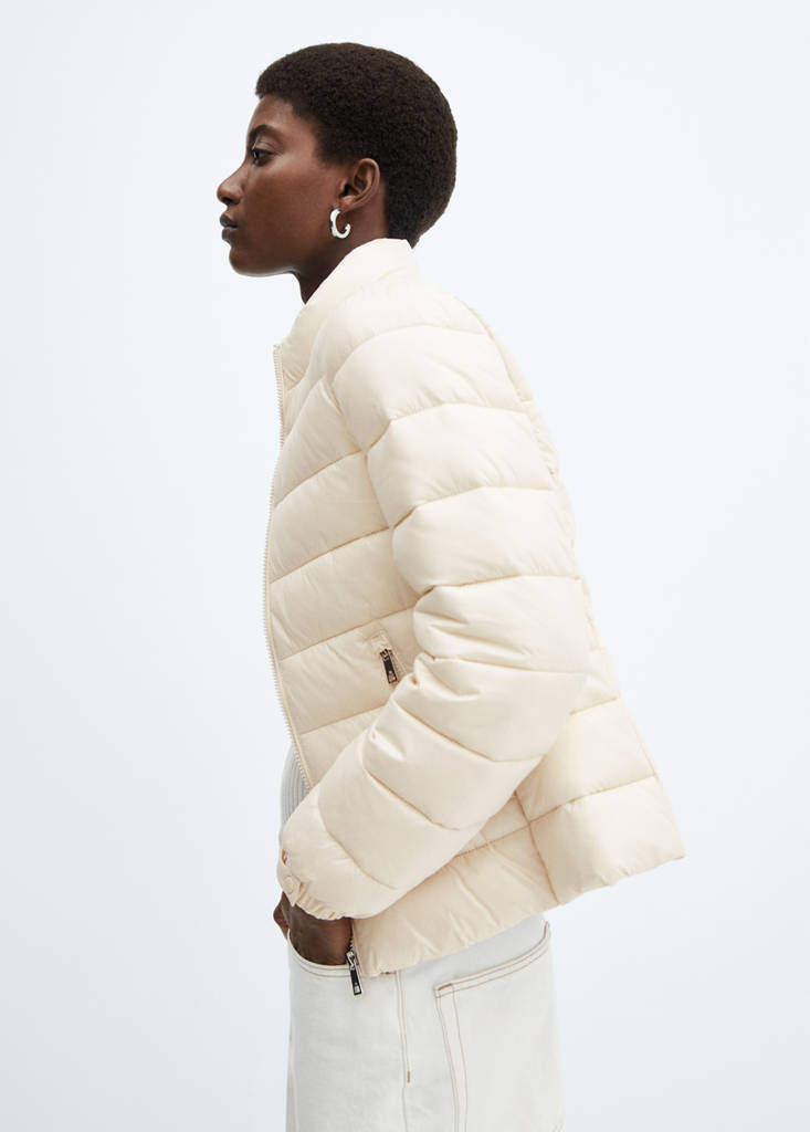 Straight design. Quilted design. High neck. Long sleeves with elastic cuffs. Zip pockets on both sides. Front zip closure. Inner lining. Available Plus. Water-repellent: The durable finish of this garment protects against light rain, repelling contact with water and raindrops. Nylon fabric. Long sleeves with buttoned cuffs