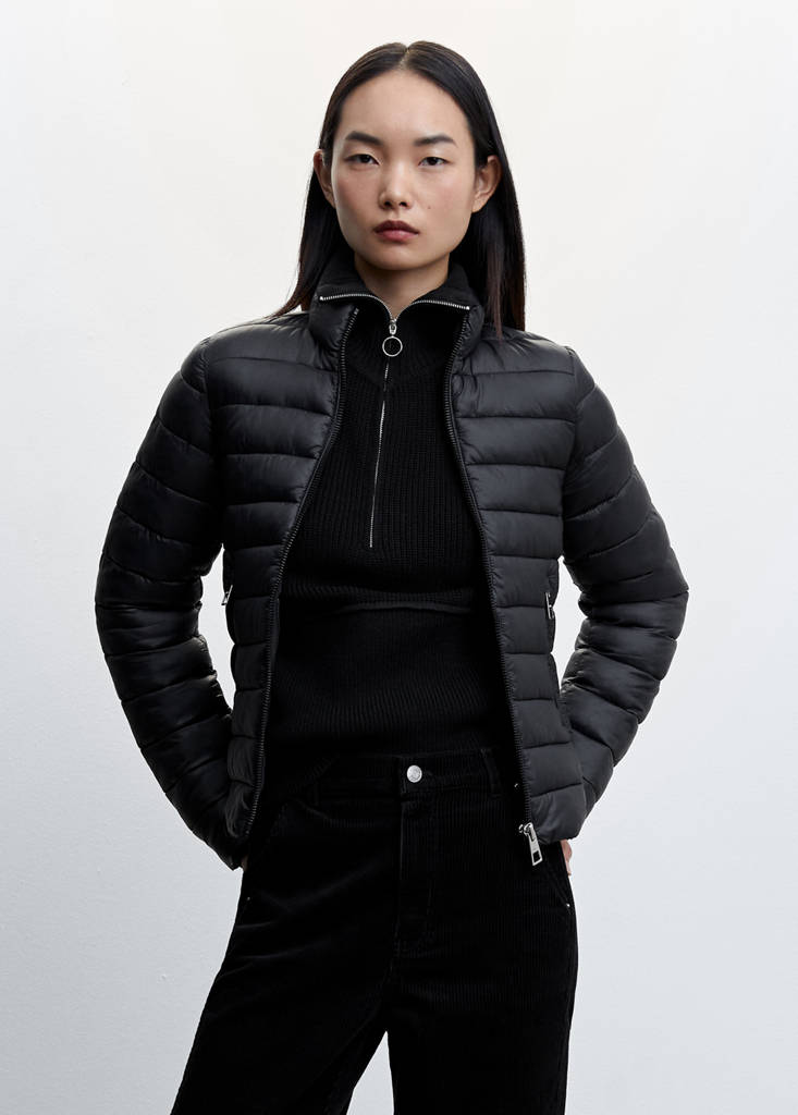 Ultralight quilted coat. Quilted design. Short design. Heavy structure. Recycled polyester padding. High neck. Zip fastening on the front section. Long sleeves. Two zip pockets on the front. Inner lining. This garment belongs to our Gift Guide. Available Plus. Water-repellent: The durable finish of this garment protects against light rain, repelling contact with water and raindrops