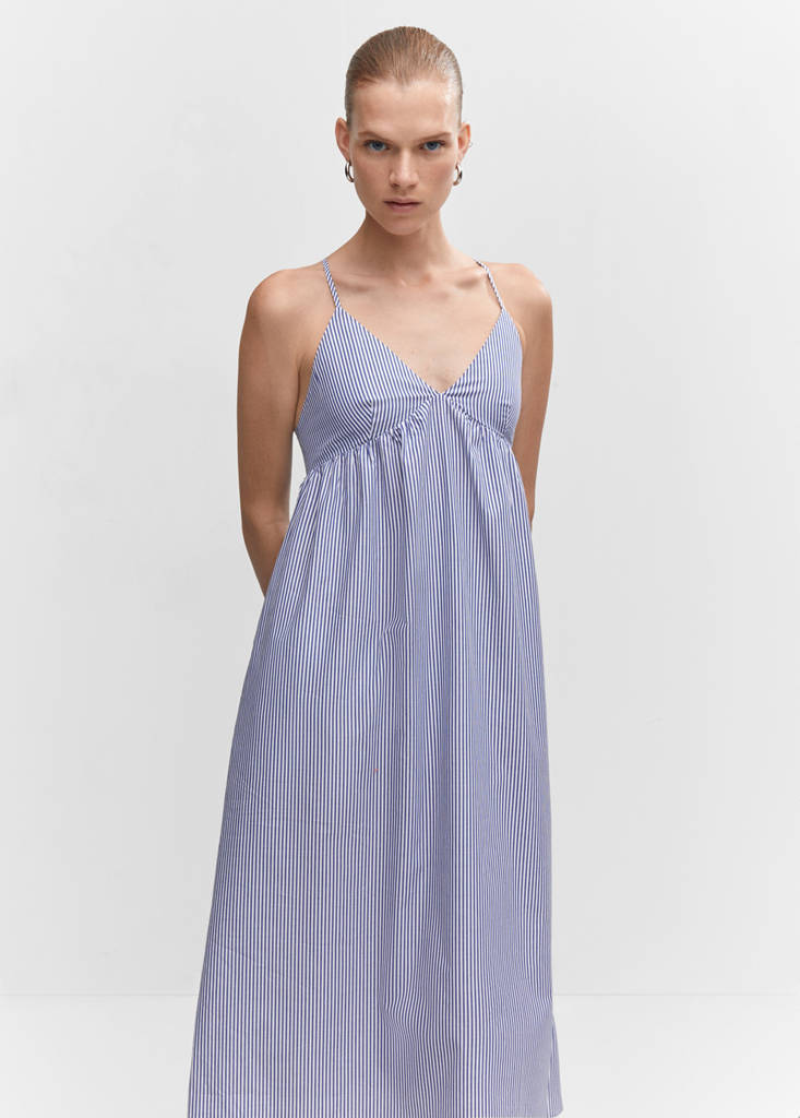 Straight design. Midi design. Available in plain and patterned. V-neck. Thin straps. Crossover straps on the back. Zip fastening on the back section. 100% cotton fabric