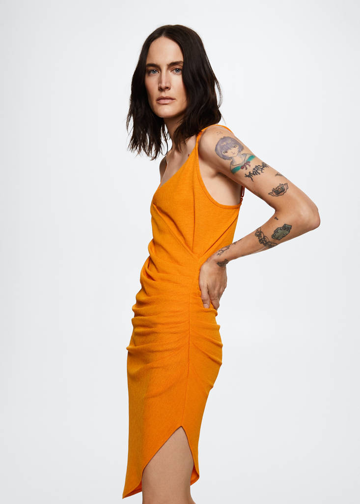 Ruched detail dressPrice historyInitial price struck through [€ 45,99 ]€ 45,99Current price [€ 30,99 ]€ 30,99-33 %Select a colourOrangeSelect your sizeXSNot available. I want it!SNot available. I want it!MNot available. I want it!LNot available. I want it!DimensionsNotify meElastic. Short design. Fitted design. Gathered detail on the sides. Thin straps. Asymmetric hem. Crew neck. Party and events collectionDetails, composition and careStore availability