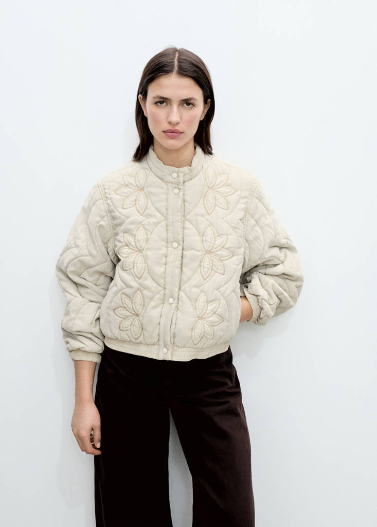Quilted design. Straight design. Flowered embroidery. Stand-up collar. Long sleeves with ribbed trims. Two side pockets. Elastic gathered hem. Front closure with snap buttons. Inner lining. The grey colour is exclusive online