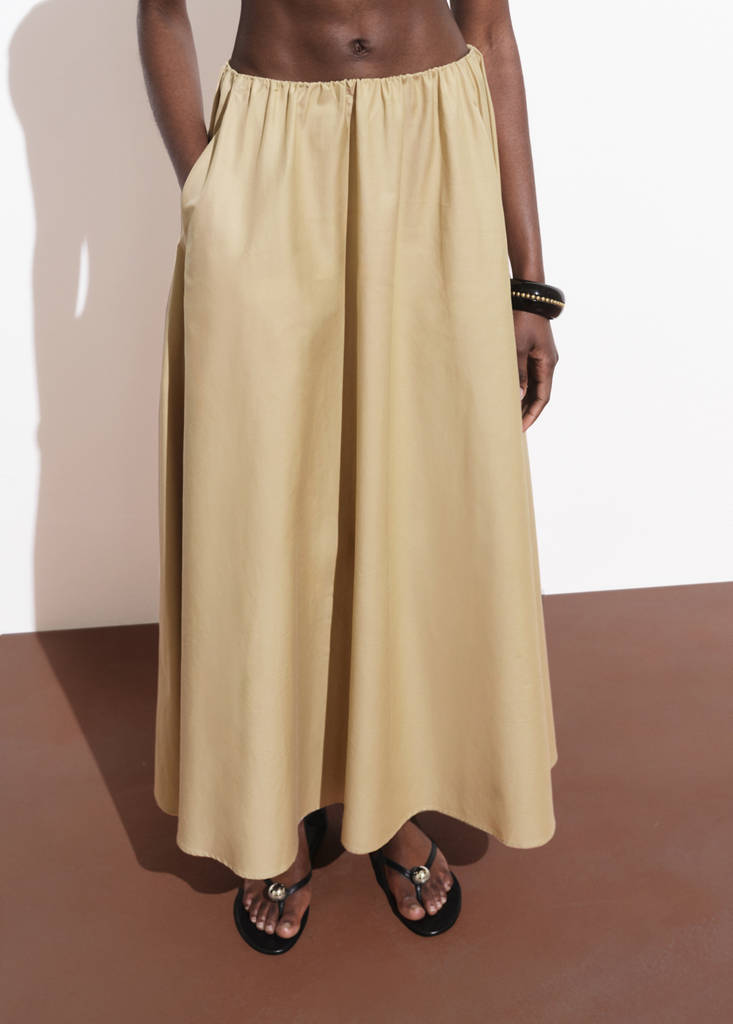 Cotton blend fabric. Long design. A-line design. Low waist. Two side pockets. Elasticated waistband. Total look