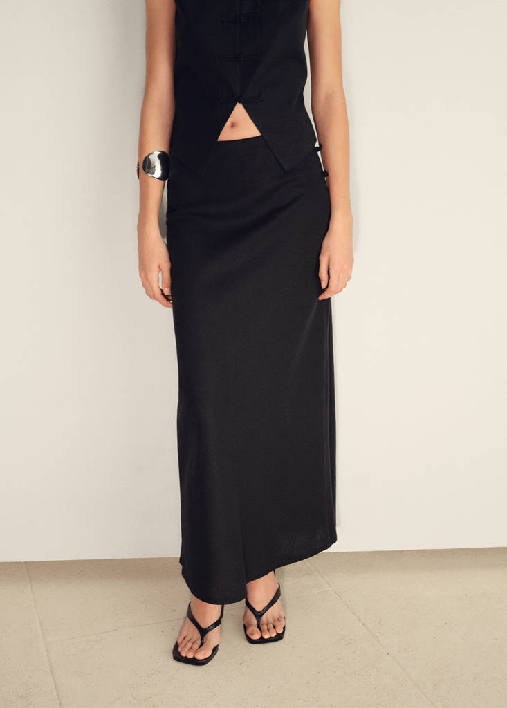 Cotton and linen blend fabric. Long design. Straight design. Mid-rise. Side button fastening. Total look
