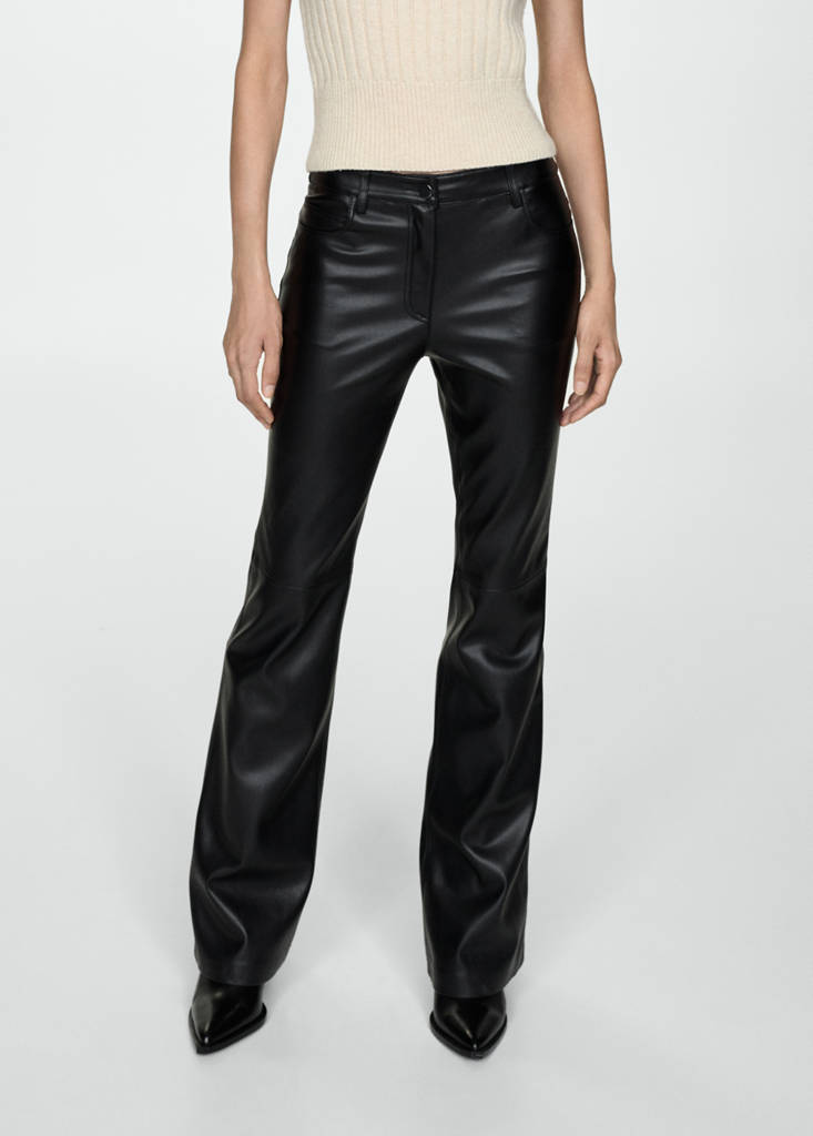 Faux-leather flared trousersPrice historyInitial price struck through [€ 49,99 ]€ 49,99Second price struck through [€ 33,99 ]€ 33,99Current price [€ 11,99 ]€ 11,99-76 %Select a colourBlackSelect your size32Not available. I want it!34Not available. I want it!36Not available. I want it!38Last few items!40Last few items!42Not available. I want it!44Not available. I want it!DimensionsAddFaux leather. Long design. Flare design. Mid-rise. Zip and button fastening. Five pockets. Belt loopsDetails, composition and careStore availability
