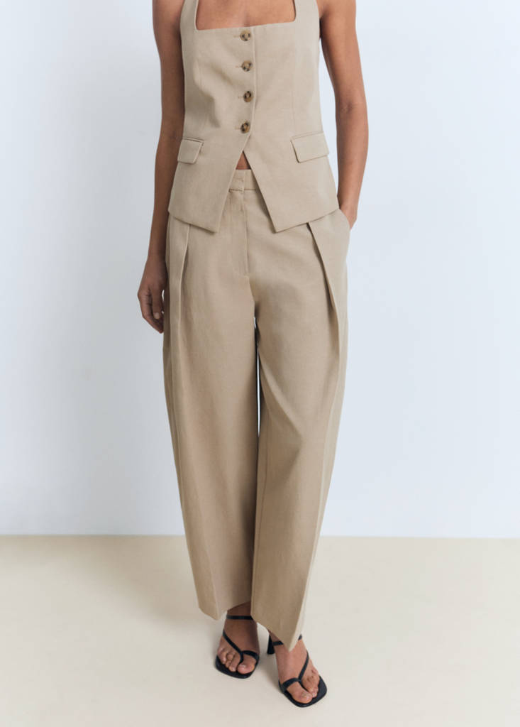 Cotton and linen blend fabric. Suit style. Balloon Design. Mid-rise. Dart detail. Two side pockets. Two welt pockets at the back. Concealed button, hook and zip fastening. 100% cotton lining. Total look. The red colour is an online exclusive