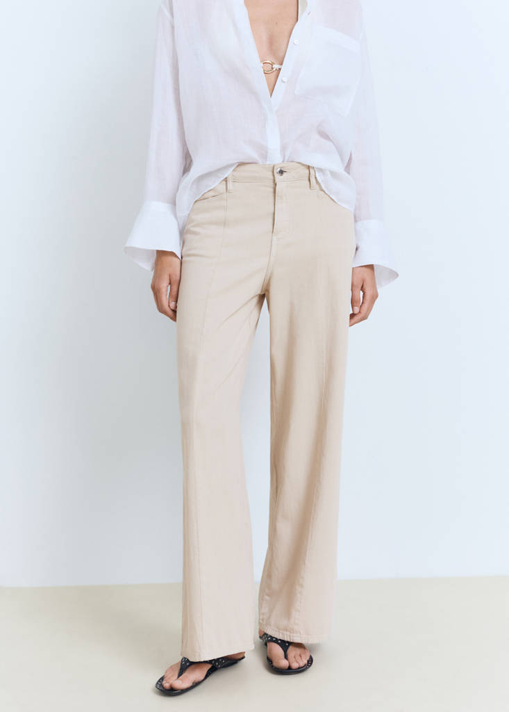 Cotton and linen blend fabric. Denim jeans style. Straight design. Mid-rise. Belt loops. Jeans with tie closure. Elastic band on the back. Front zipper and button closure