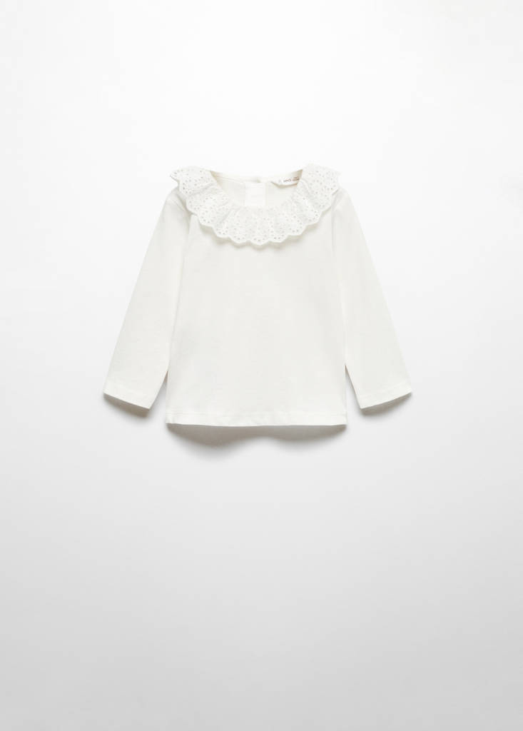 100% coton. Coupe droite. Broderie suisse sur le col. Col babydoll. Manche longue. Fermeture à boutons. Broderie décorative. Fermeture à boutons