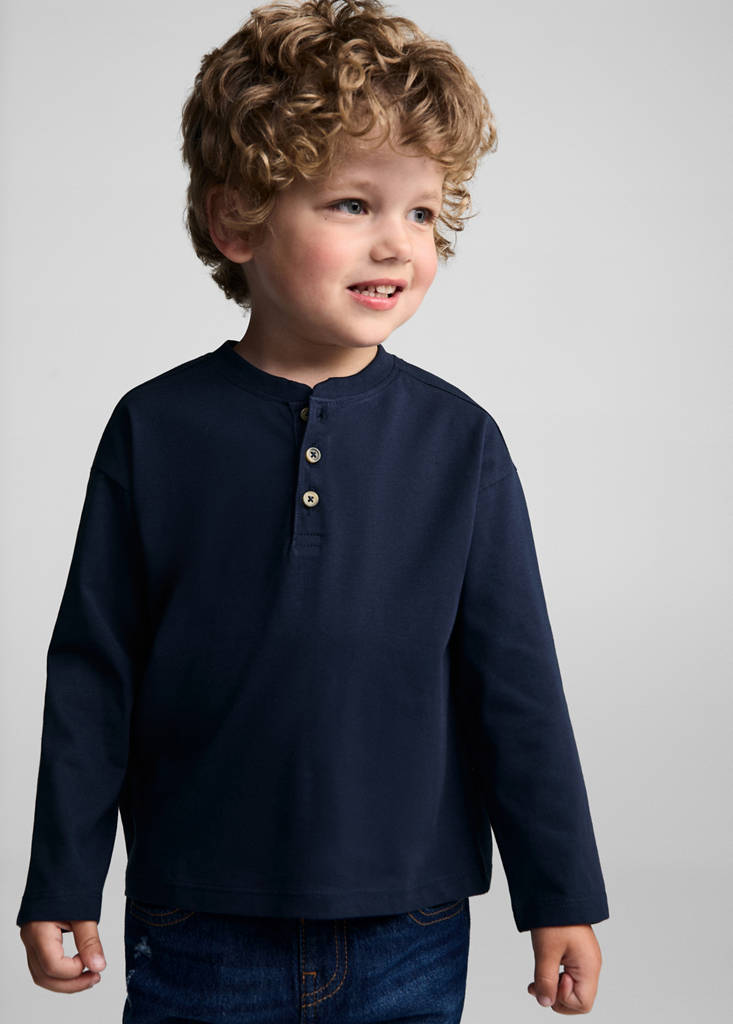 100% coton. Coupe droite. Col rond. Manche longue. Fermeture à boutons