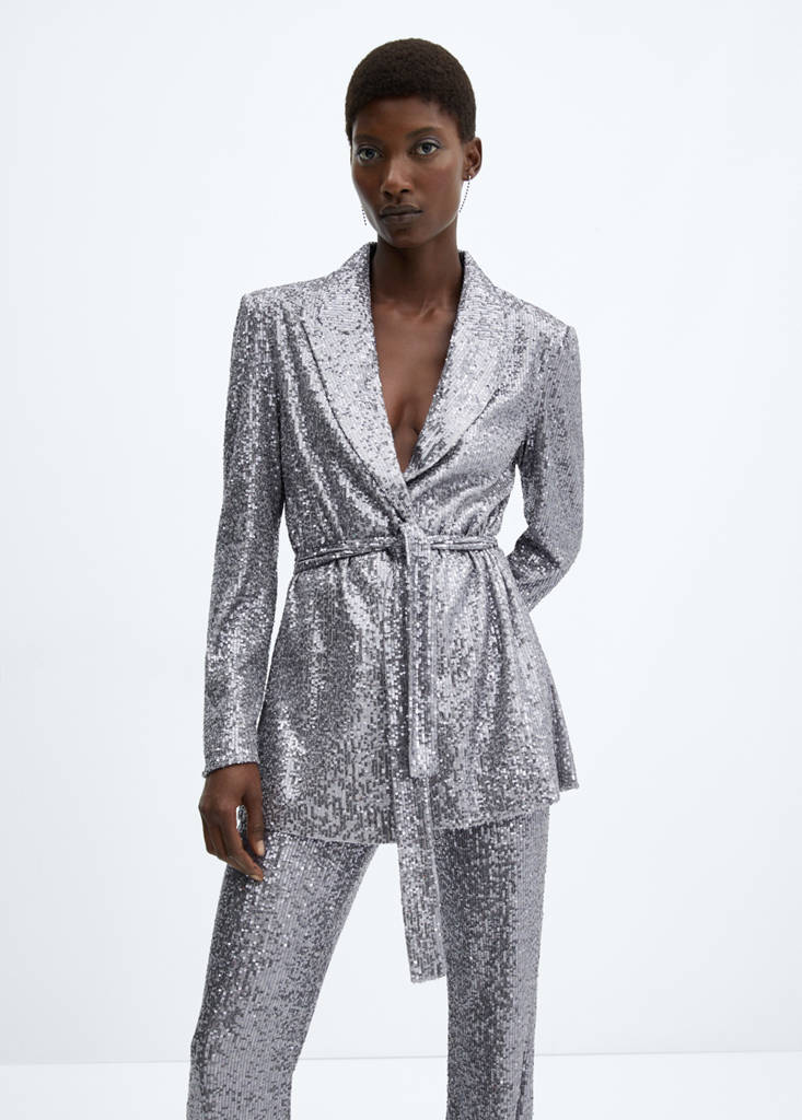 Tissu en sequins. Design long. Col en V avec rabat. Manches longues cloche. Ruban à la taille avec fermeture à nœud. Ceinture amovible. Doublure