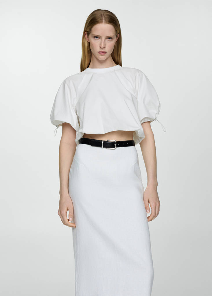 Design crop. Coupe droite. Col rond. Manches courtes bouffantes. Fermeture zip à l'arrière. Tissu 100 % coton