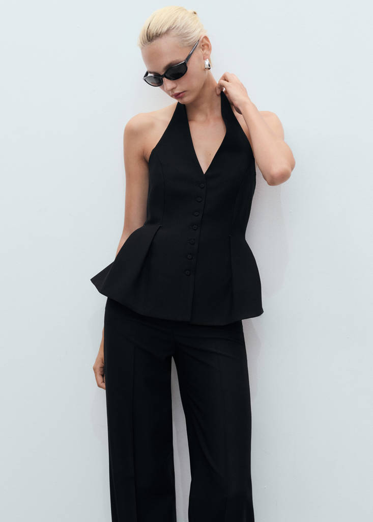 Ce gilet présente une coupe péplum et un col à emmanchures américaines. Associez-le à un pantalon droit assorti pour un total look
