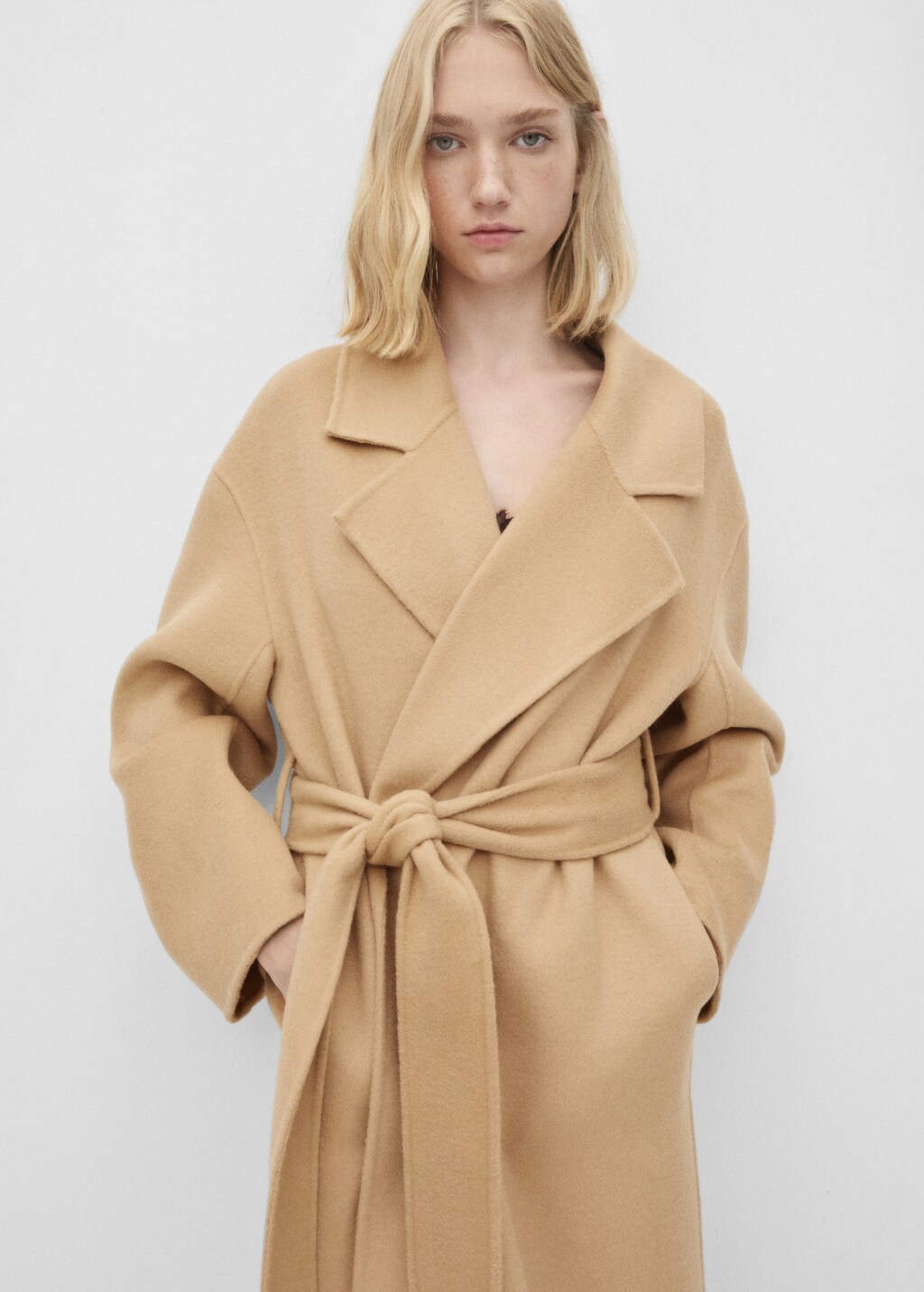 Design oversize. Design long. Manches longues. Gilet intérieur amovible. Collection Selection. Tissu de laine mélangé. Col en V avec rabat. Revers crantés. Deux poches latérales. Ceinture ajustable.