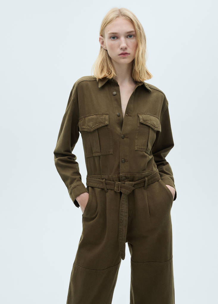 Tissu en coton de style jean. Design long. Coupe droite. Col chemise. Manche longue. Poignets boutonnés. Fermeture à boutons sur le devant. Deux poches latérales. Deux poches à rabat sur la poitrine. Passants de ceinture. Ceinture amovible