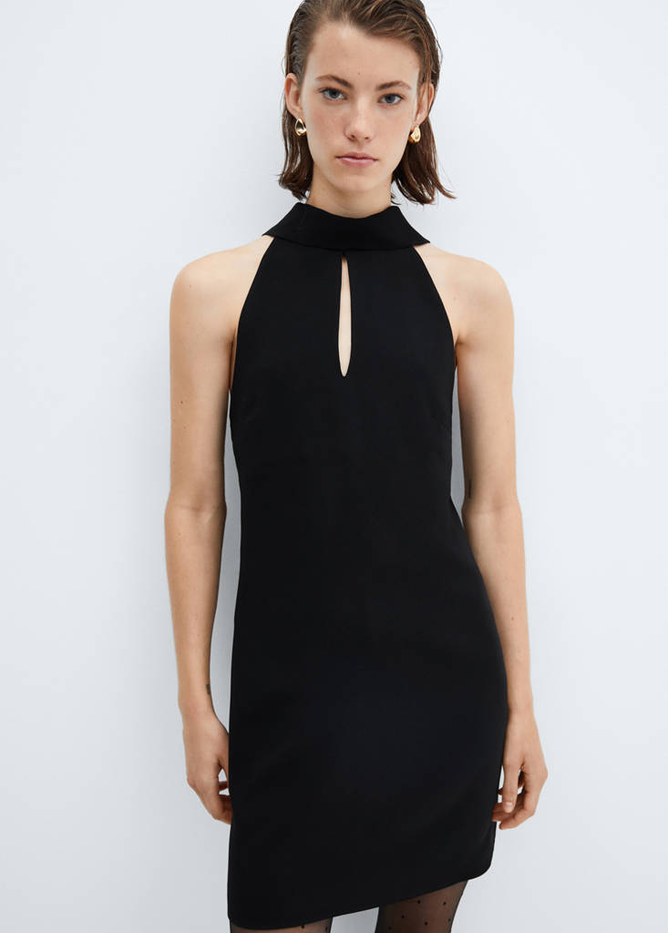 Tissu fluide. Coupe droite. Coupe courte. Col halter. Sans manches. Ouverture dans le dos avec bouton. Ouverture à l'avant. Fermeture zip à l'arrière. Lanières décoratives. Collection fêtes, cérémonie et communion. Looks de bureau
