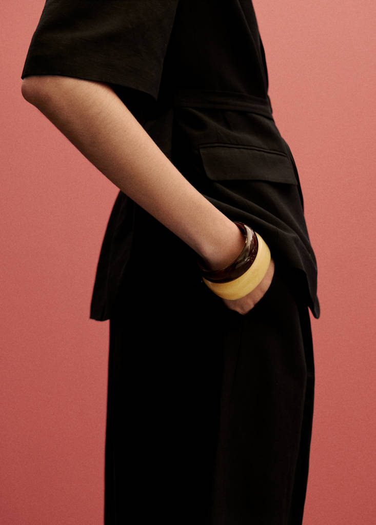 Tissu en lin mélangé. Style costume. Coupe droite. Coupe courte. Taille mi-haute. Passants de ceinture. Deux poches latérales. Pinces. Fermeture avant par bouton, crochet et zip caché sous patte. Total look