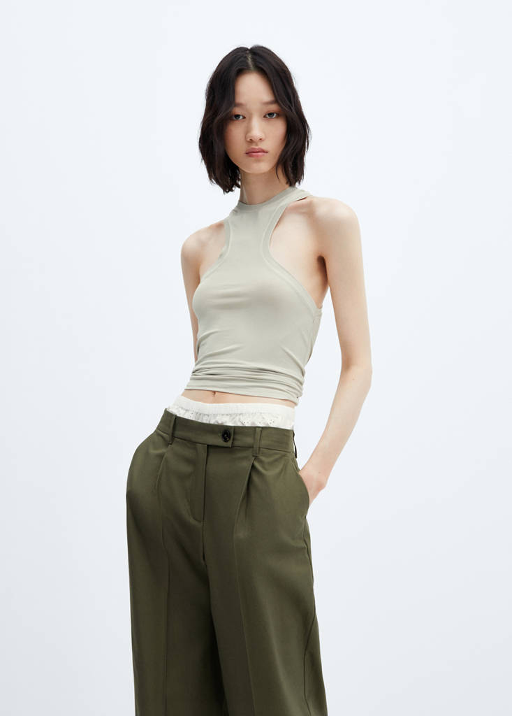 Tissu fluide. Col halter. Bretelles larges. Sans manches. Coupe cintrée