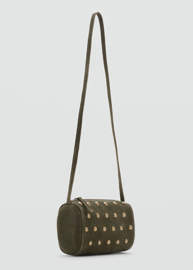 100% Cuir. Design rond. Bandoulière réglable. Fermeture à zip. Ornement de clous