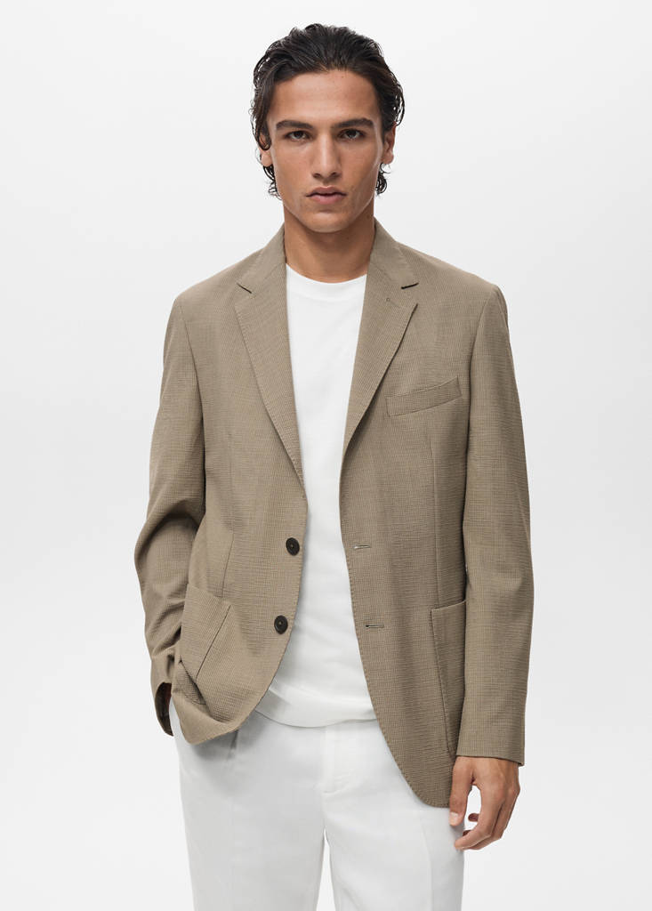 Collection Selection. Slim fit. Tissu en laine froide. Revers crantés à boutonnière. Poche passepoilée sur la poitrine. Fermeture avant avec boutons. Deux poches plaquées latérales. Double fente à l’arrière sur le bas. Poignets à patte boutonnée