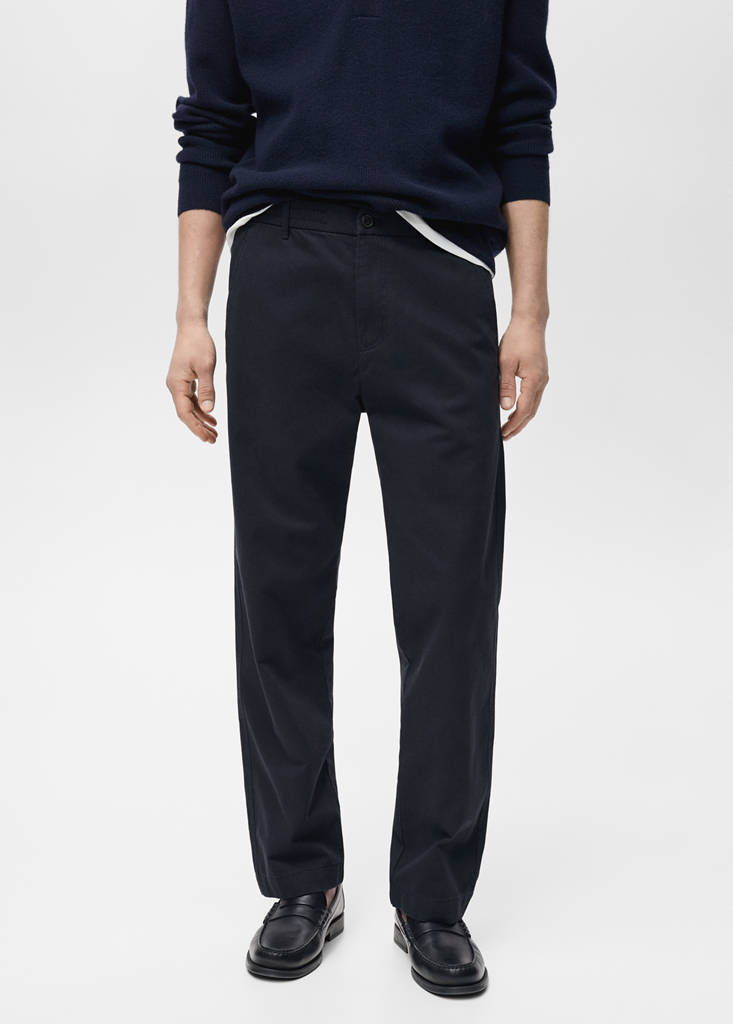 Tissu 100 % coton. Coupe regular. Taille élastique avec cordon ajustable. Fermeture éclair et bouton. Passants pour ceinture. Deux poches latérales. Deux poches passepoilées à l'arrière. Tissu de coton
