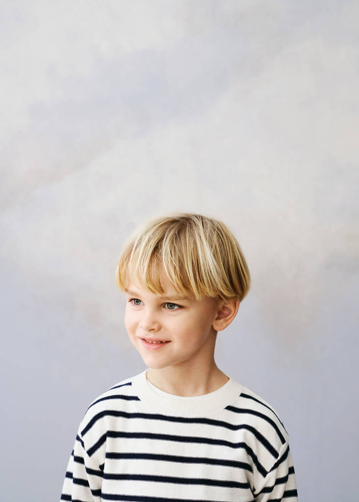 100% Cotton. Fine knit fabric. Straight design. Striped design. Round neck. Long sleeves. Ribbed collar, cuffs and hem. Button fastening on the back section