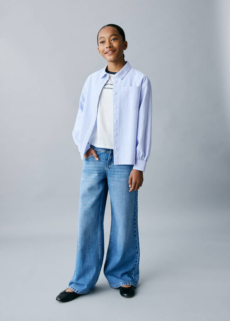100% cotton fabric. Striped design. Shirt collar. Long sleeves. Cuffs with flap and button. Ruched detail on the cuffs. Front closure with buttons