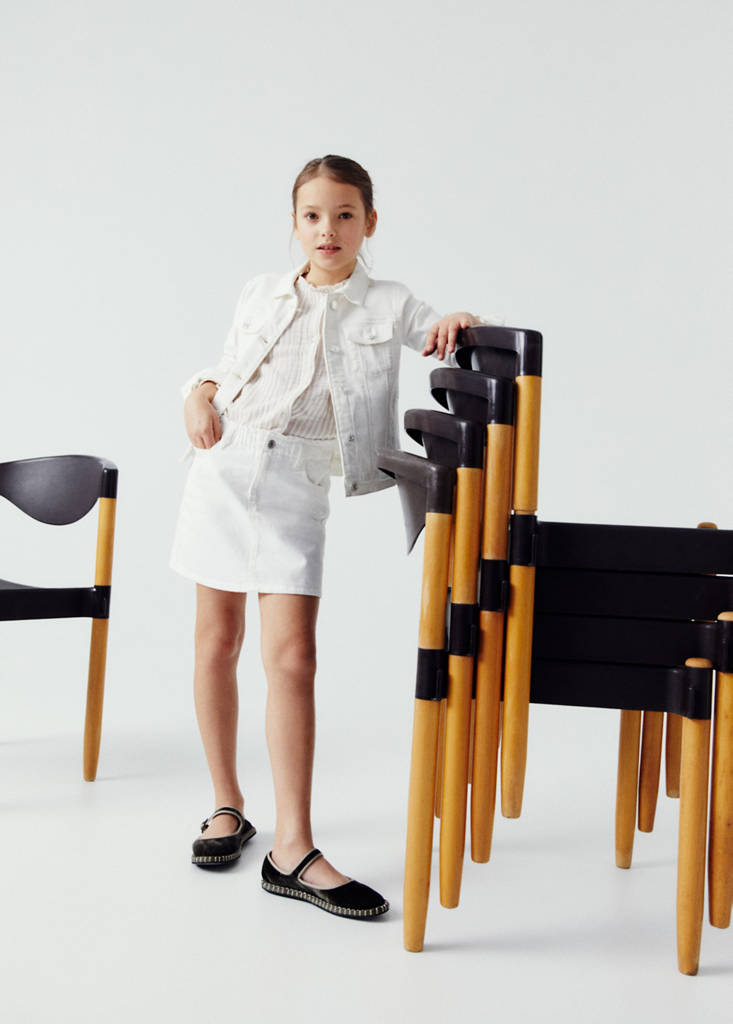 Front closure. Elastic band. Denim-style cotton fabric. Short design. Flared design. Elastic paperbag waistband. Belt loops. Two patch pockets at the back. Zip and button fastening