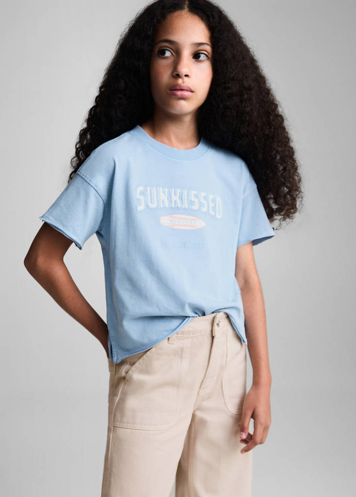 Back to school collection. 100% Cotton. Washed-effect colour. Surf print. Embroidered detail. Round neck. Short sleeves. Heavy weight