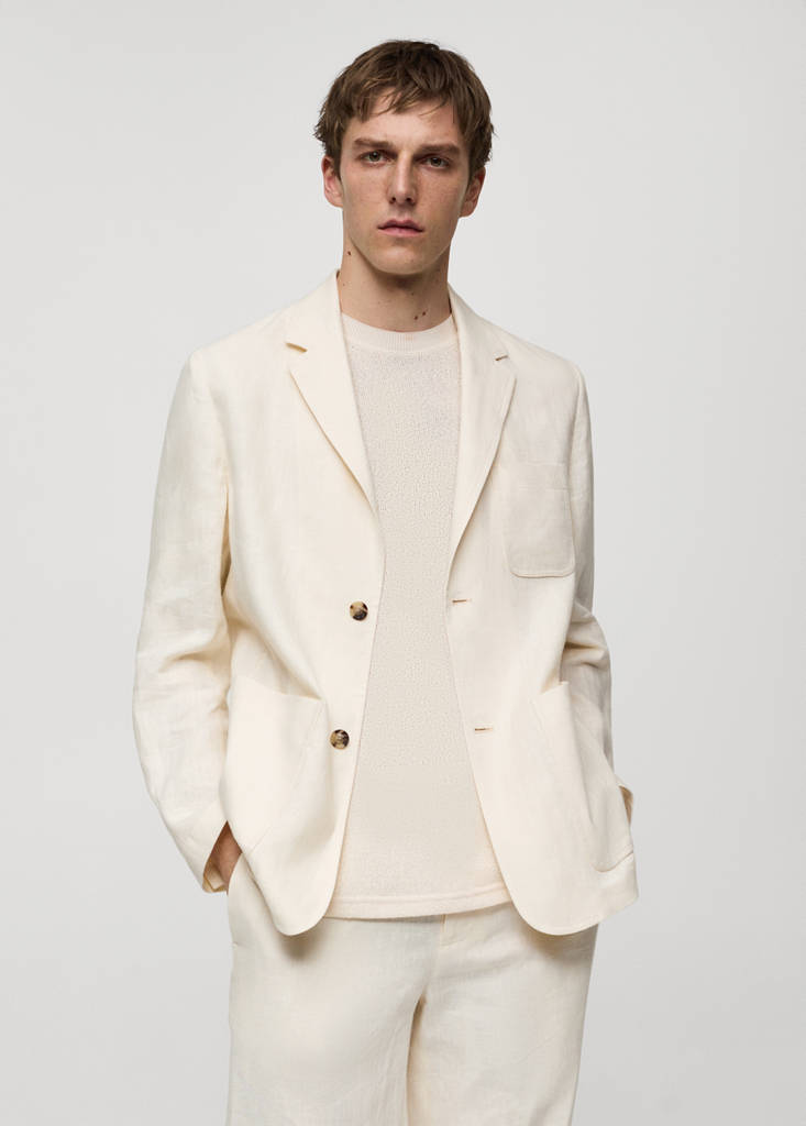 Set available as total look. Relaxed fit. 100% linen fabric. Notched lapel collar. Patch pocket on the chest. Two patch pockets at the front. Long sleeves with buttoned cuffs. Opening at the centre of the hem. Without inner lining. Front closure with buttons